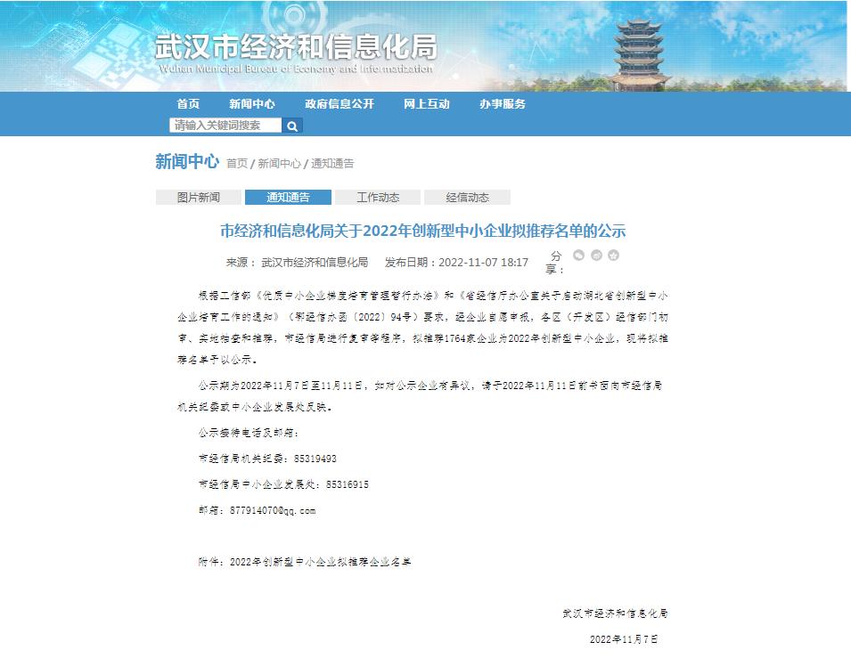 2022年11月7日,武漢市經濟和信息化局發布消息稱,根據工信部《優質中小企業梯度培育管理暫行辦法》和《省經信廳辦公室關于啟動湖北省創新型中小企業培育工作的通知》(鄂經信辦函〔2022〕94號)要求,經企業自愿申報,各區(開發區)經信部門初審、實地抽查和推薦,市經信局進行復審等程序,擬推薦1764家企業為2022年創新型中小企業,現將擬推薦名單予以公示(公示期為2022年11月7日至11月11日)。武漢信達易通科技有限公司成功上榜!