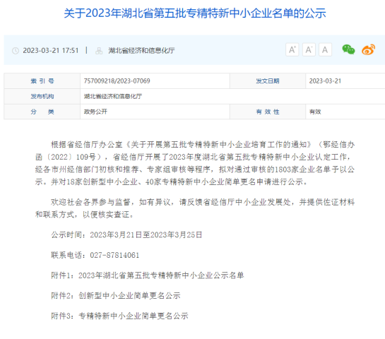根據省經信廳辦公室《關于開展第五批專精特新中小企業培育工作的通知》(鄂經信辦函〔2022〕109號),省經信廳開展了2023年度湖北省第五批專精特新中小企業認定工作,經各市州經信部門初核和推薦、專家組審核等程序,武漢信達易通科技有限公司于2023年3月21日通過審核并予以公示。