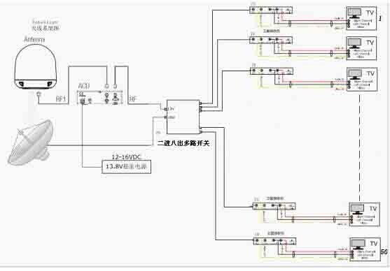 本系統由船載動中通衛星電視接收天線(室外單元)、ACU控制單元、功分器、多路開關、終端接收機主要組成。